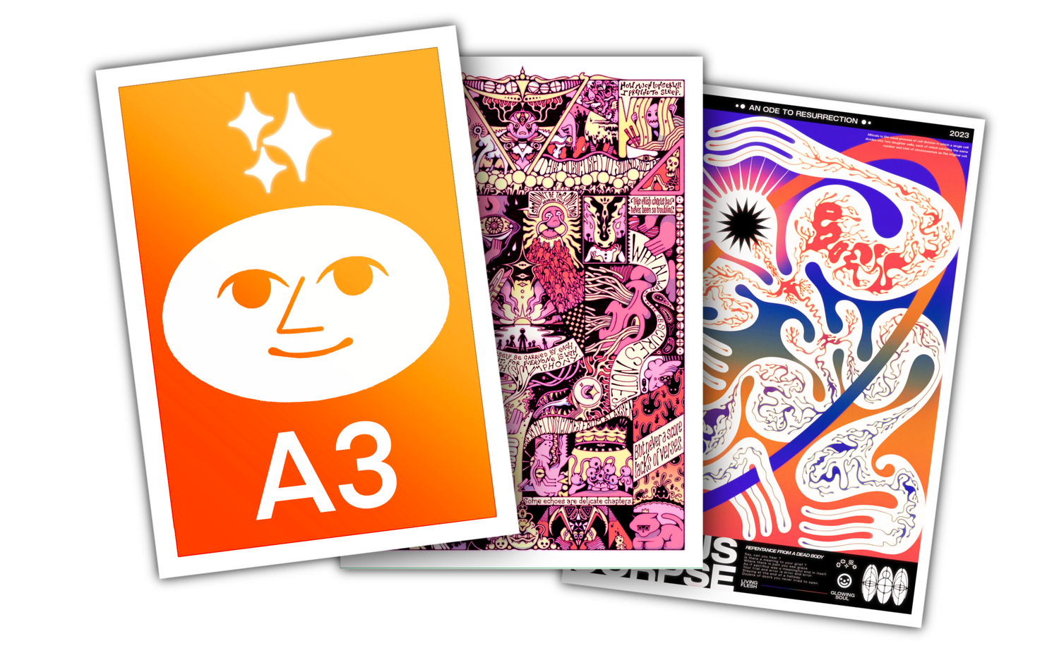 L'offre "Triple A3" vous permet pour l'achat de deux formats A3 (n'importe lesquels) d'en obtenir un troisième à -50% (selon une sélection de print comportant : Multipode F.R.E.D. / VISUALVISION / Pandemical Pandemonium / Happiness / CursedFood / ECHOES / CORPSE / The Key)